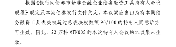 12月27日,萬科在《關於在交易商協會披露<關於2022年度第五期中期票據2025年第 一次持有人會議的答覆公告>的提示性公告》中表示,22萬科MTN005展期議案因「反對本議案的22萬科MTN005持有人或持有人代理人共29家,有效表決權數額為35,820,000,佔總表決權數額的96.81%;其他表決權均棄權。」所以「22萬科MTN005的本次持有人會議的本議案未生效。」