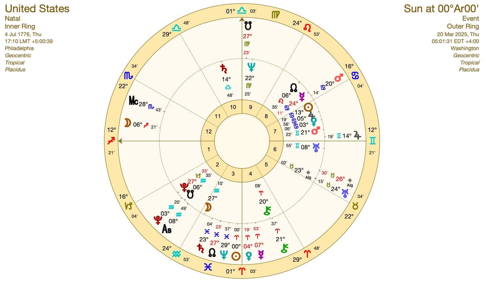 一般而言,占星師會以春分盤(3月20或21日)作為判斷某地全年運勢的基準。本文將回顧美國、中國及香港於2025年的春分盤,並結合已經發生的事件,藉此說明占星術在預測時勢上的準確程度。礙於篇幅限制,本文採用國家盤(內盤)與春分盤(外盤)合盤的方式,重點在於呈現具標誌意義的春分盤,如何對當地現實運作產生實質影響。