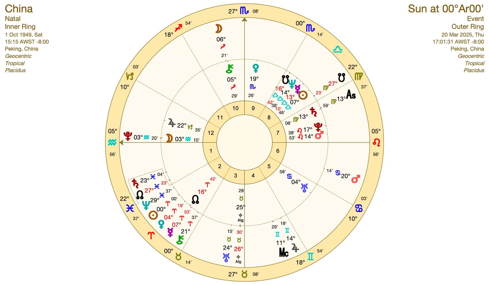 中國的春分盤顯示,問題行星主要集中於與外交及官民關係相關的第七宮,並與位於第三宮、涉及貿易與訊息、同樣關乎安全感與民意的月亮人馬形成流暢相位,同時又與天底合相,因而同樣容易出現政府與人民之間的觀感落差。換言之,政權在實際運作中可能侵害對方利益,卻仍對外宣稱勤政愛民;然而民眾所體驗到的,卻是官方敘事與現實處境之間的明顯裂縫。再加上月亮人馬與第十宮木星雙子形成對分相,所謂的經濟復甦更像是對外展示的形象工程,實際上只是鏡花水月。