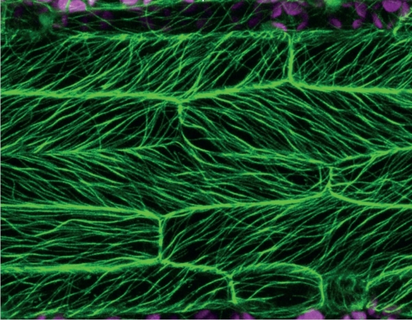為了在太空中走得更遠、停留更久,太空人需要可持續的營養來源。NASA正在研究不同植物如何適應太空的嚴酷環境,這有望為未來的太空作物提供借鏡。這張圖片呈現二穗短柄草(Brachypodium distachyon)的葉片細胞。