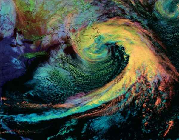 2024年2月14日,美國國家海洋和大氣管理局(NOAA)與NASA合作的聯合極地衛星系統(JPSS)捕捉了一場東北風暴(nor’easter)。圖片顯示,一大片旋轉的雲團從加拿大東部一直延伸到加勒比海地區。