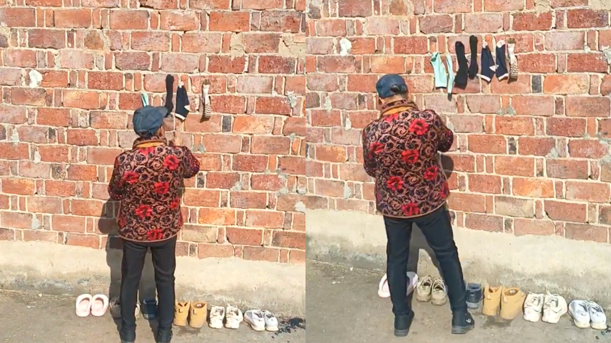 影片中,只見老人將洗好的襪子,一隻一隻往粗糙的磚牆上輕輕一甩,襪子彷彿被施展了奇妙魔法,全都牢牢地掛在牆上了。