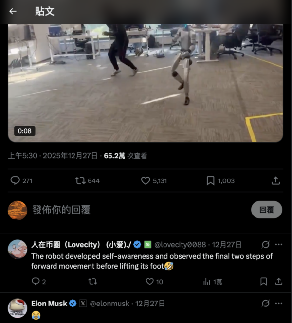 Tesla首席工程師韋斯・莫里爾12月26日轉發了該影片,馬斯克在評論區留下「爆笑」表情符號。