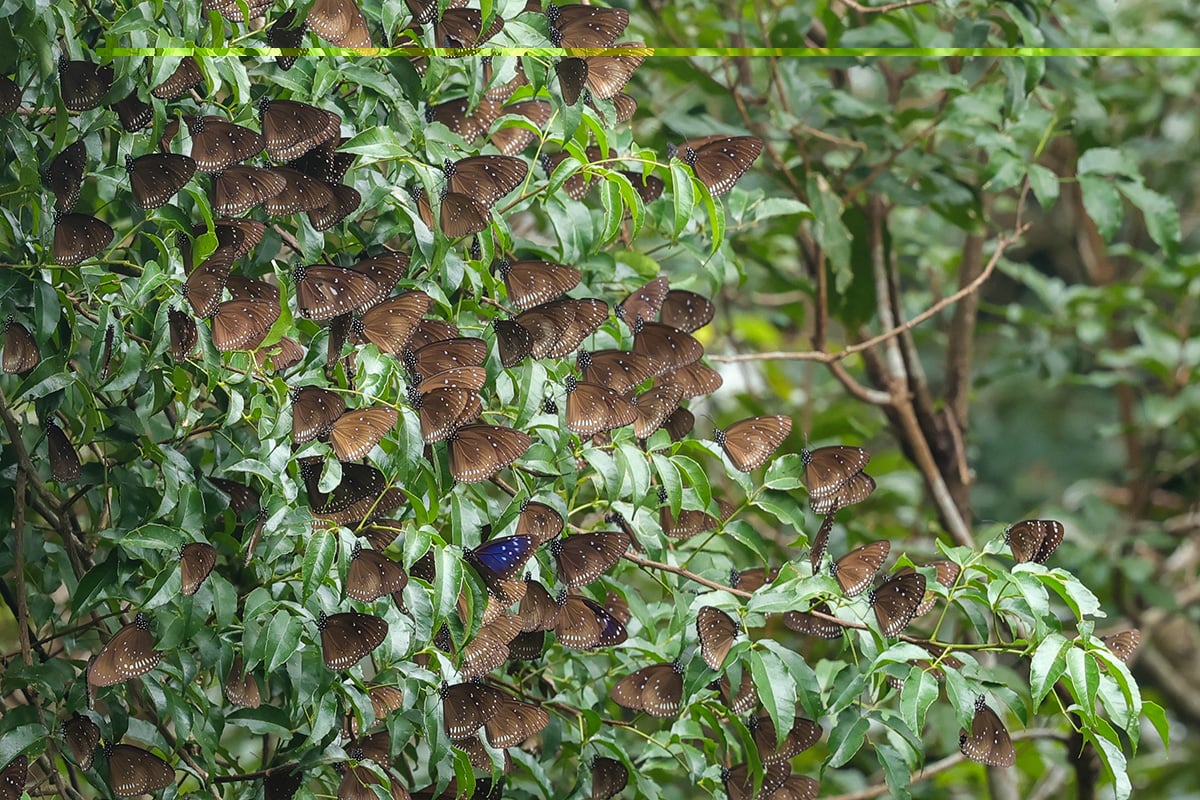 最新一次錄得大量越冬斑蝶是在本月24日,位置大部份處於南大嶼郊野公園邊陲,屬山谷雜木林生境,面積約4,000平方米,經點算估計有超過5,400隻,以屬烏鴉型的藍點紫斑蝶為主。