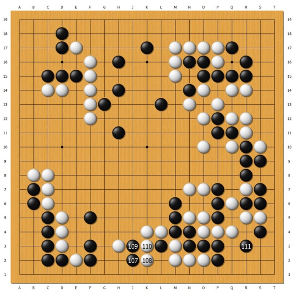 雖然兩人形成互破之勢,但相比之下,白棋處理稍顯不當,黑棋鳩佔鵲巢,在白右下角輕鬆活出,全盤已無弱棋。至黑111手,王星昊空多棋厚,奠定優勢。