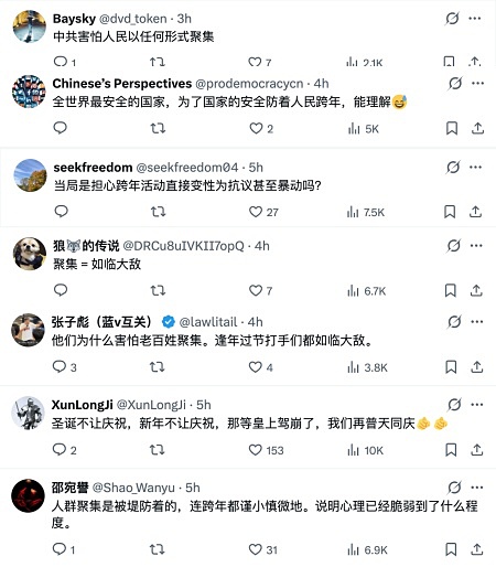 「跨年不放煙花,先放警力;海岸像前線,市民如嫌疑。治安靠圍欄,歡樂靠審批,這就是所謂的『穩定壓倒一切』。」