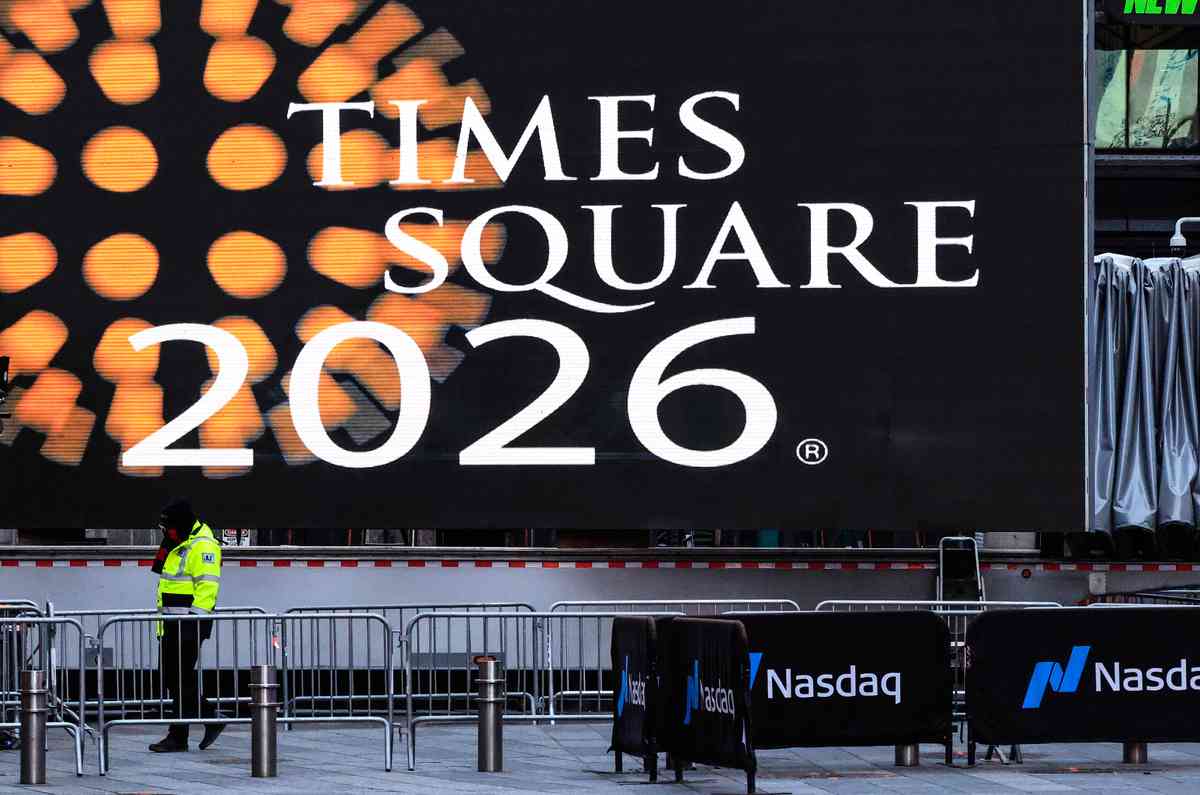 在零度以下的低溫中,工作人員正於時代廣場(Times Square)架設安全護欄與舞台,迎接即將到來的年度降球儀式。