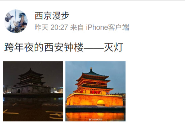 2025年12月31日晚,陝西西安的鐘樓附近戒備森嚴。網傳影片和照片顯示,鐘樓滅燈,鐘樓附近的道路封路,並有不少警察駐守。當地早已通知取消跨年活動,加上當晚雨夾雪的天氣,影片中並沒有看到有人聚集跨年。據「大眾新聞」報道,跨年夜,西安交警等多個部門集結鐘樓,嚴陣以待。當地網民不屑地表示,「今年沒人。」「至於嗎?」