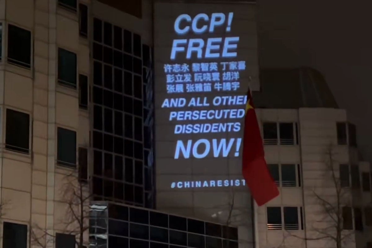 海外民間組織「中國行動」(China Action)於德國柏林時間昨晚(1日)約7時,在中共駐德國大使館對街架設投影設備,將多位「良心犯」名單等投射至使館外牆。這是該組織繼去年於中共駐紐約總領事館發起類似行動後,首次將此類政治訴求投影抗議擴展至歐洲地區。