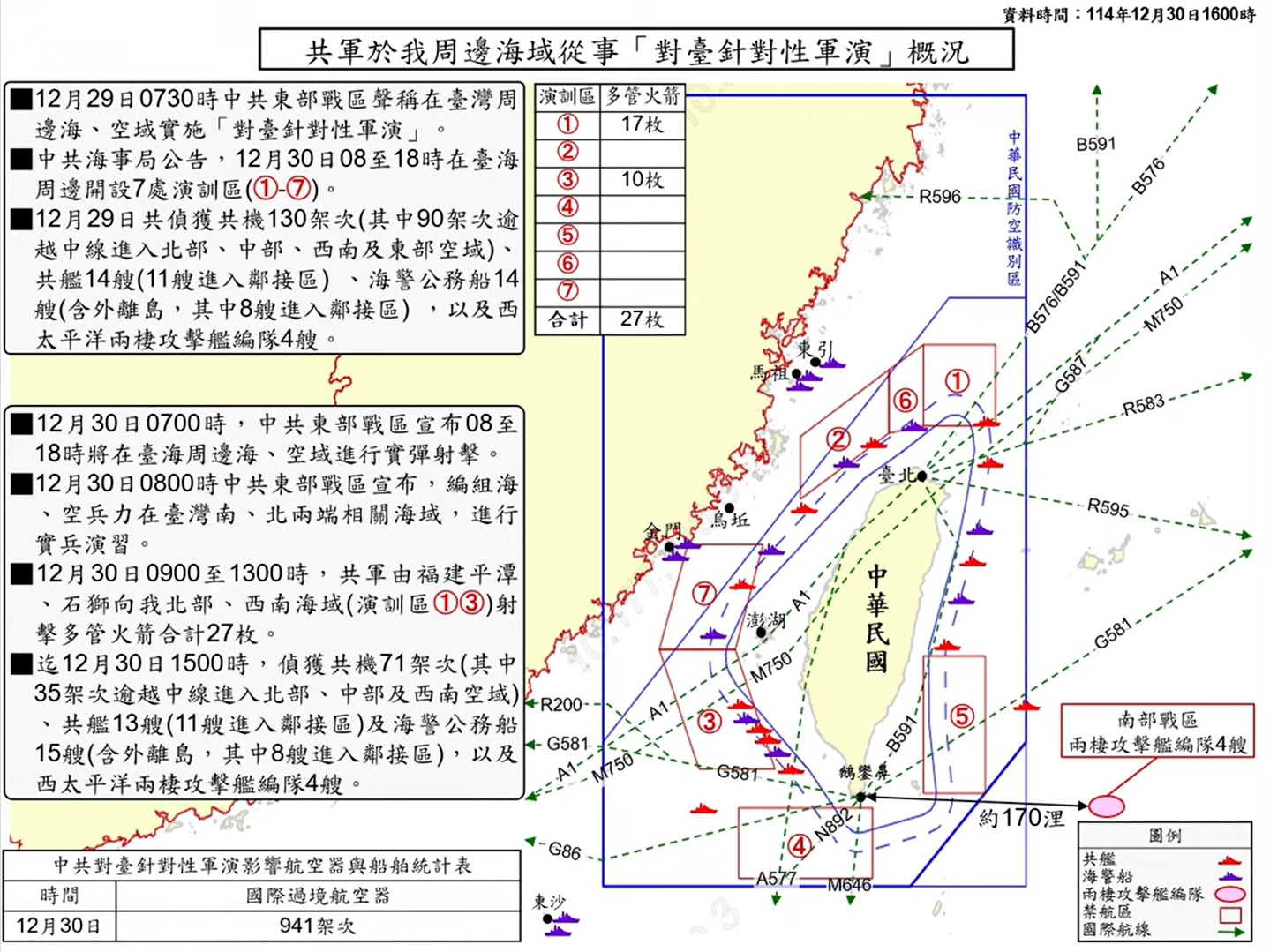 中共宣布12月29日演習,台灣軍方在12月29日6時前,已經偵獲共艦9艘、公務船2艘;到12月30日6時,增加到共艦14艘、公務船8艘;到12月31日6時,再增加到共艦17艘及公務船8艘。