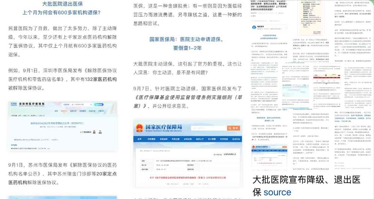 地方衛健部門公示及醫療機構公開資料顯示,近期,陝西、四川、安徽、湖南等地衛生與醫保系統發布公告,多家民營醫療機構主動調整醫院等級與經營規模,由二級下調為一級,或在保留執業資質的同時解除醫保服務協議。