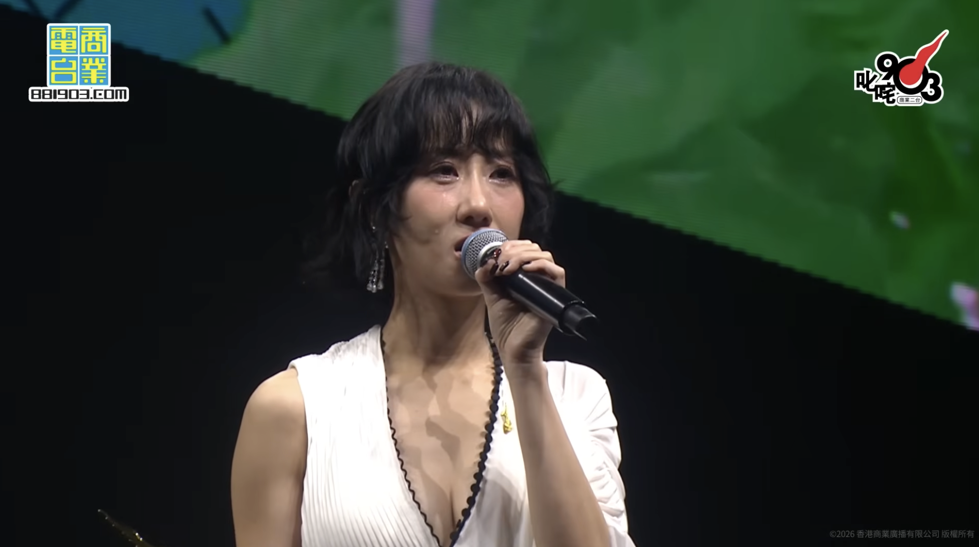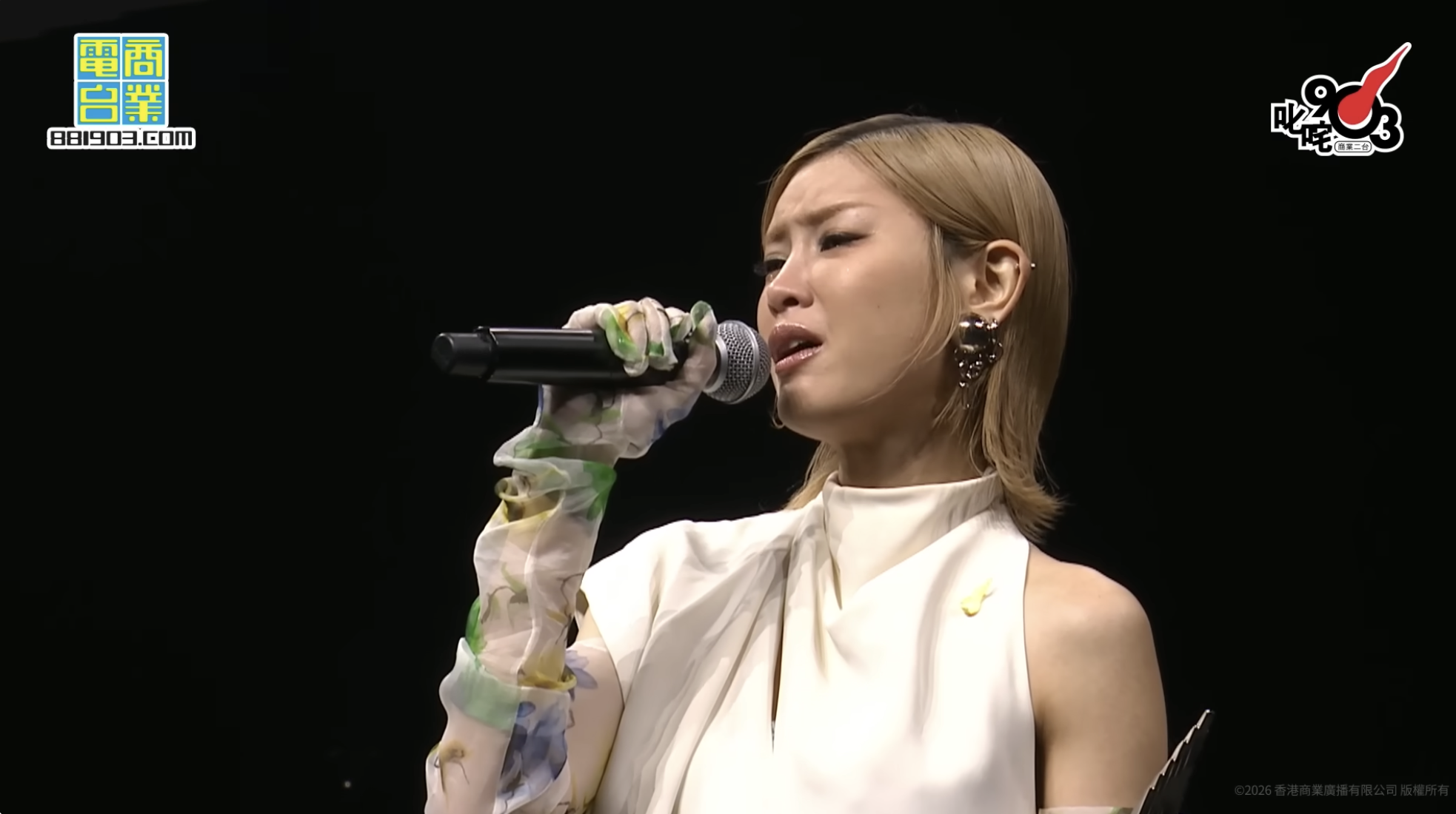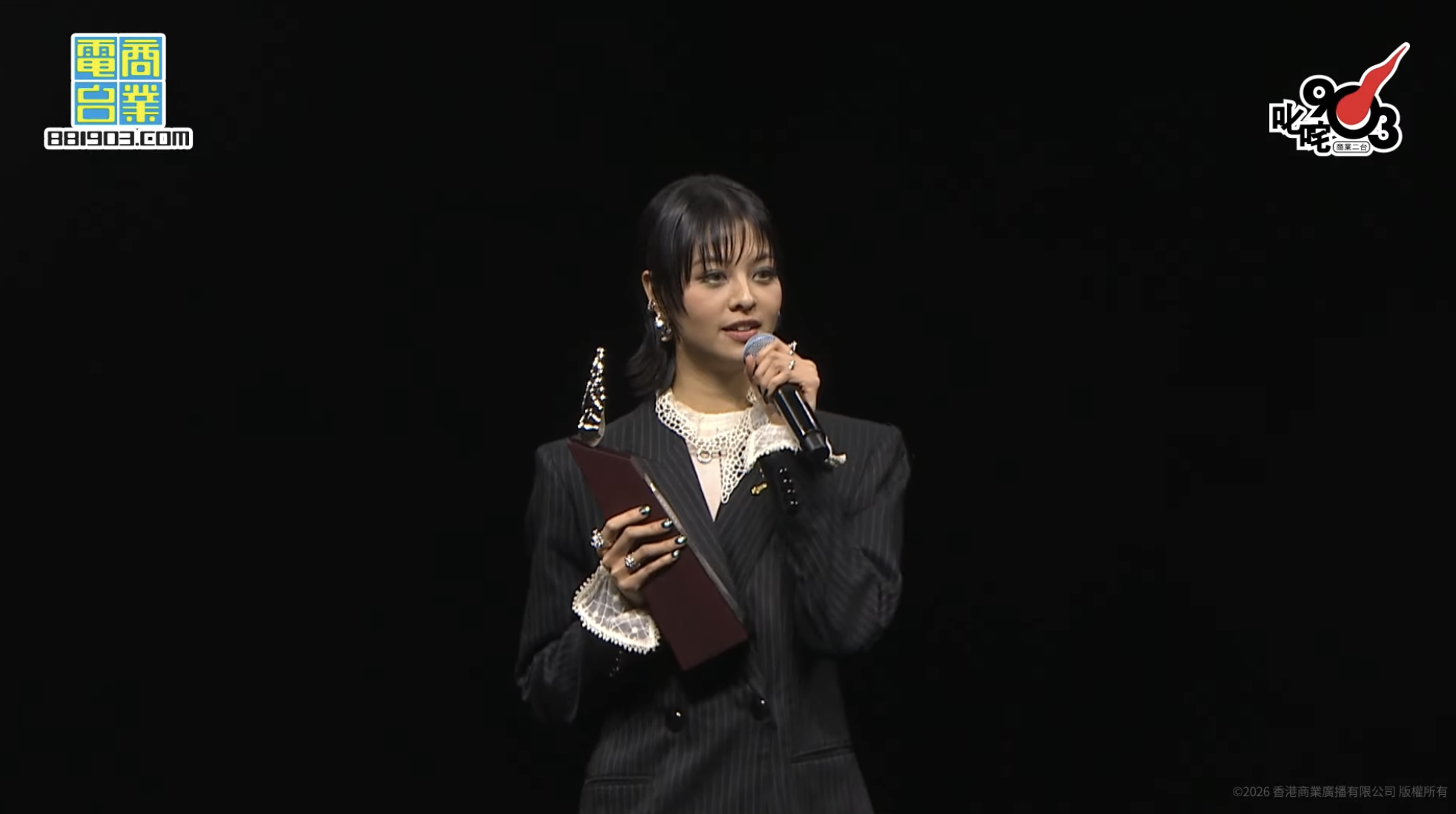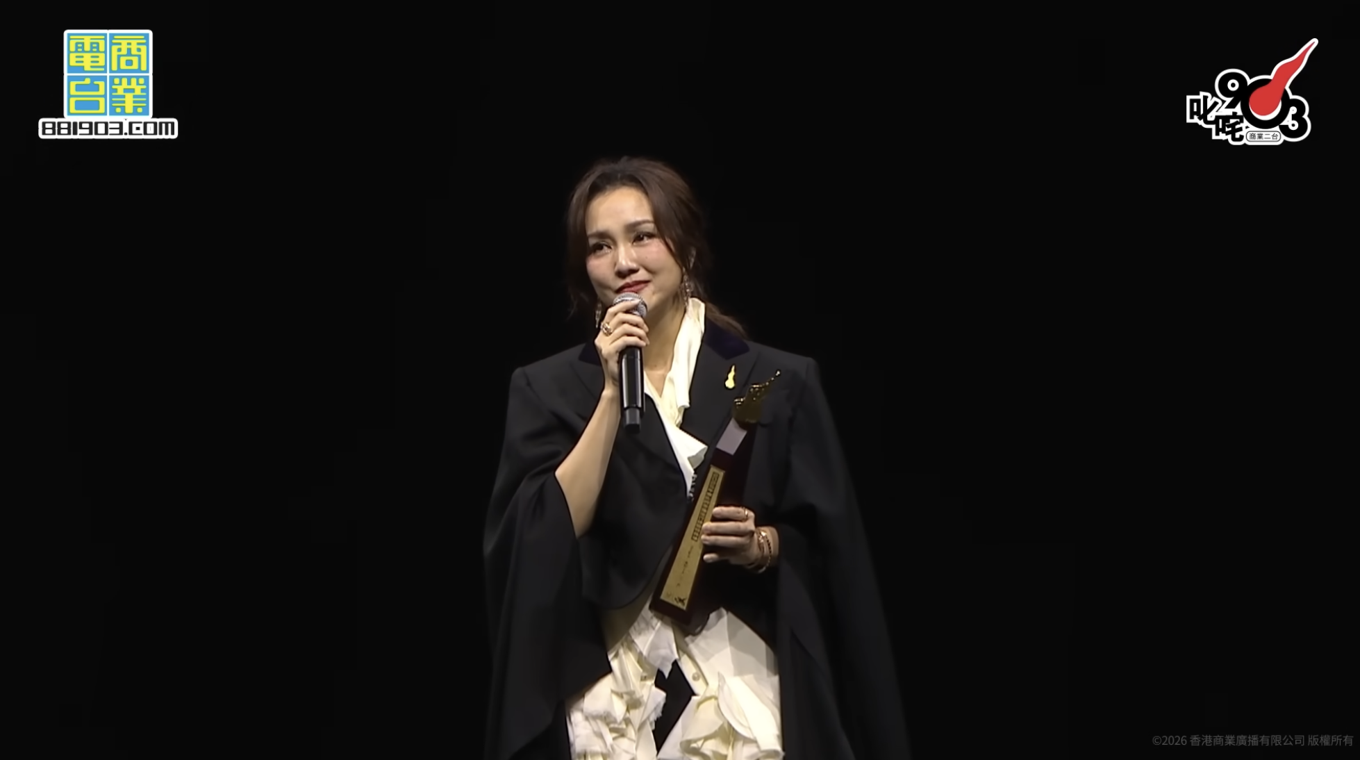 鄧麗欣上台領獎時,第一句感言是「我同自己講係唔可以喊嘅」,她說自己23年首次踏上叱咤頒獎台,當時獲新人獎,走下頒獎台後覺得離這個台好遠,「唔知幾時可以上返嚟呢個台攞獎」。
