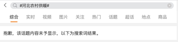 在微博,包括「河北農村供暖」「河北供暖」在內的多個話題,均已顯示為「抱歉,該話題內容未予顯示」。