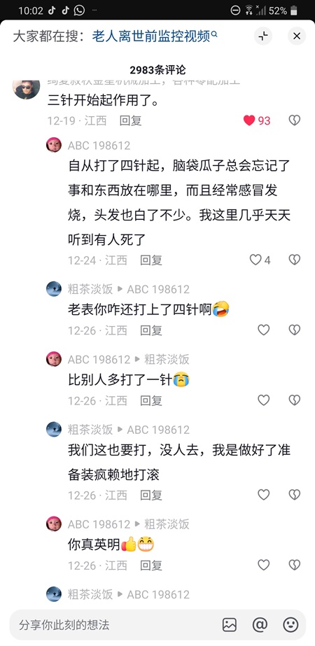 「自從打了四針,腦袋瓜子總會忘記事和東西放在哪兒,經常感冒發燒,頭髮也白了不少。我這裏幾乎天天聽到有人死了。」