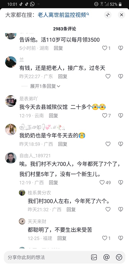 2025年12月18日,大陸博主「寧靜致遠」在其社交媒體表示,這邊的老人一個接一個的死,真的好嚇人。
