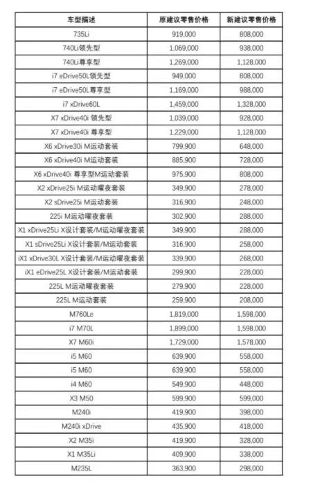 在該公告中,寶馬全面下調了旗下31款主力車型官方售價,其中,旗艦純電車型i7 M70L價格下降了30.1萬元,價格從189.9萬元跌至159.8萬元;中國產的M235L首次跌破30萬元大關,2系四門轎跑車下調至20.88萬元,創下寶馬在大陸產車型價格新低。