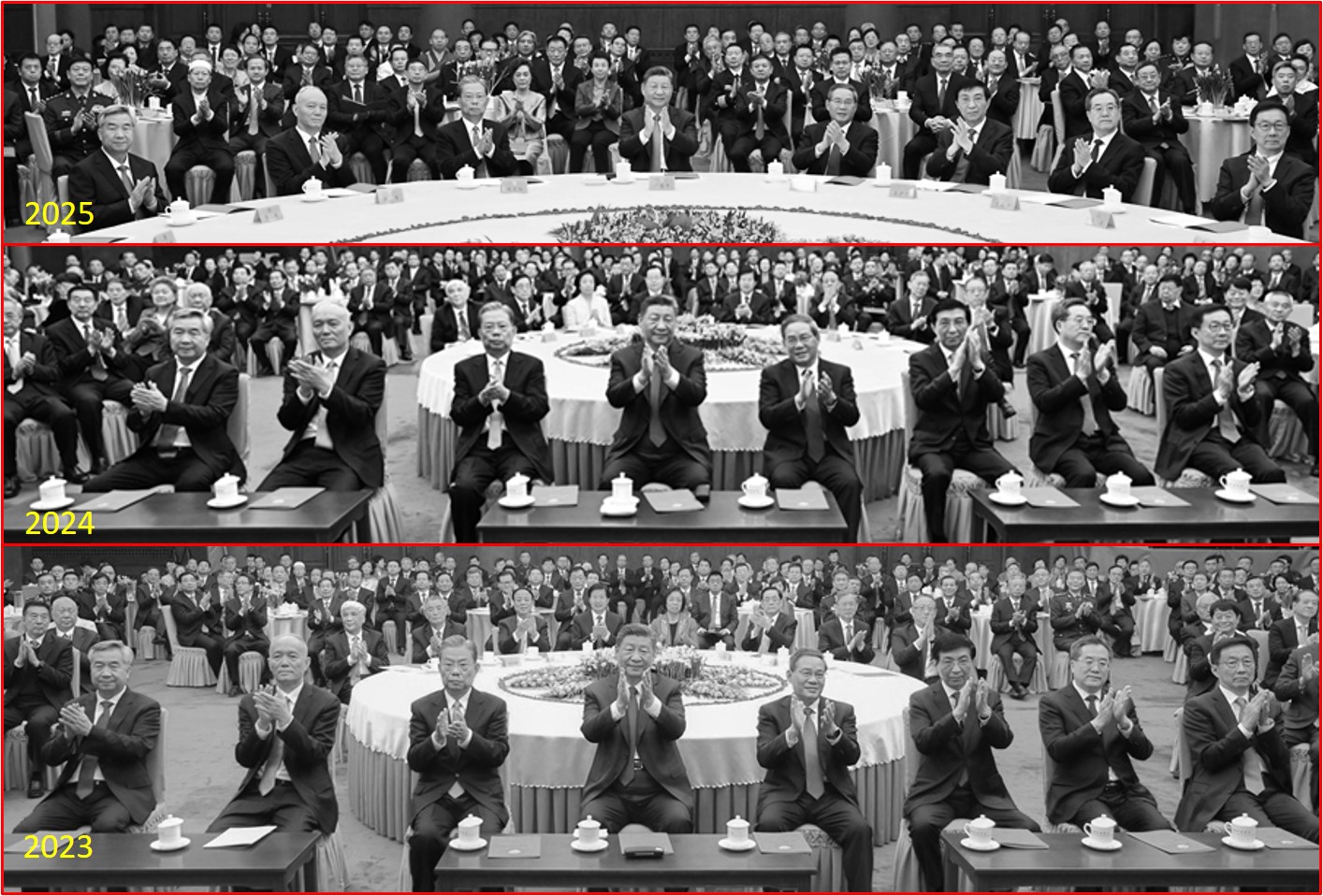 但2025年茶話會,未再按慣例添加三張條形桌;習近平與其他人一樣坐在大圓桌上觀看演出。新華社報道中配圖也改為大圓桌合照。