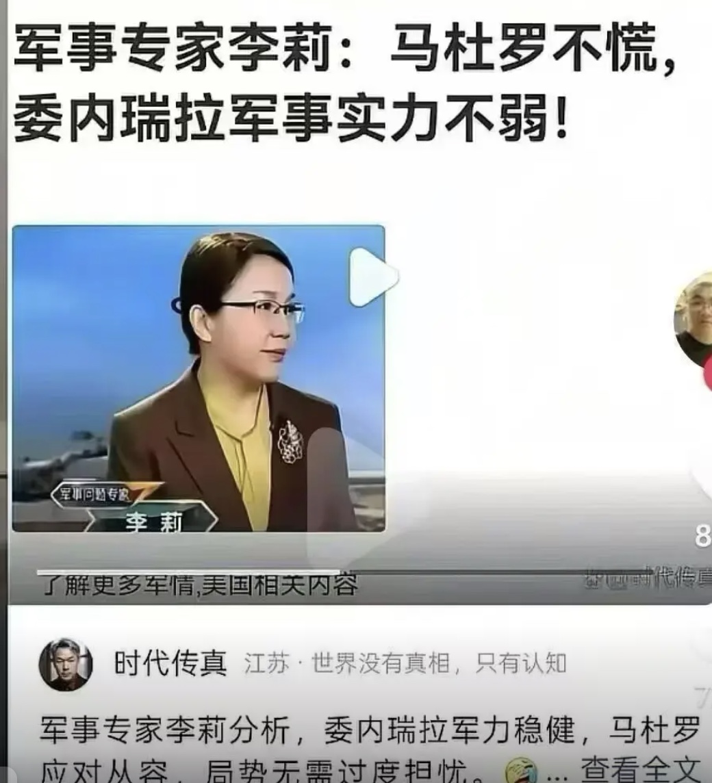 中共央視特約評論員、中共軍事評論家、國防大學教授李莉在一個月前曾稱,委內瑞拉有俄羅斯的防空導彈,美國不敢輕舉妄動,「馬杜羅不慌」。