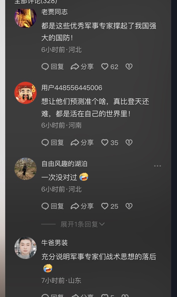 網民嘲諷,「支持李專家團隊們去營救馬杜羅。」「中國都是這樣軍事專家,必然成為軍事強國。」「充份說明軍事專家們戰術思想的落後。」「為甚麼馬杜羅不驚慌?來不及慌。」「談問題還是儘量從專業角度去談,否則很快就會成為笑話。」「但偏偏馬羅杜可能真的信了,不然也不會高調說自己就在總統府,哪也不去,有種就來。」