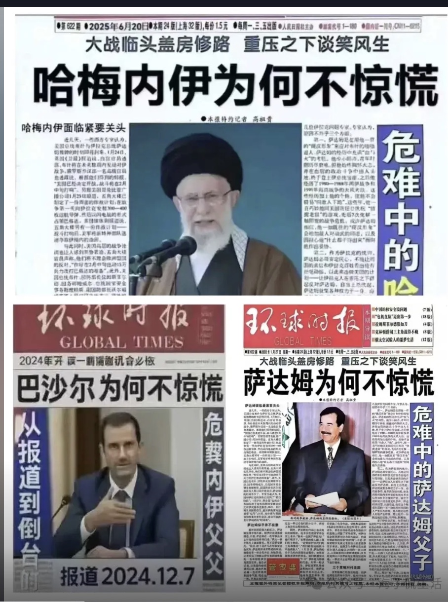 此前,中共黨媒《環球時報》曾「吹噓」伊拉克前領導人薩達姆、敘利亞前總統巴沙爾,伊朗哈梅內伊,稱這些人在美國打擊下「為何不驚慌」。