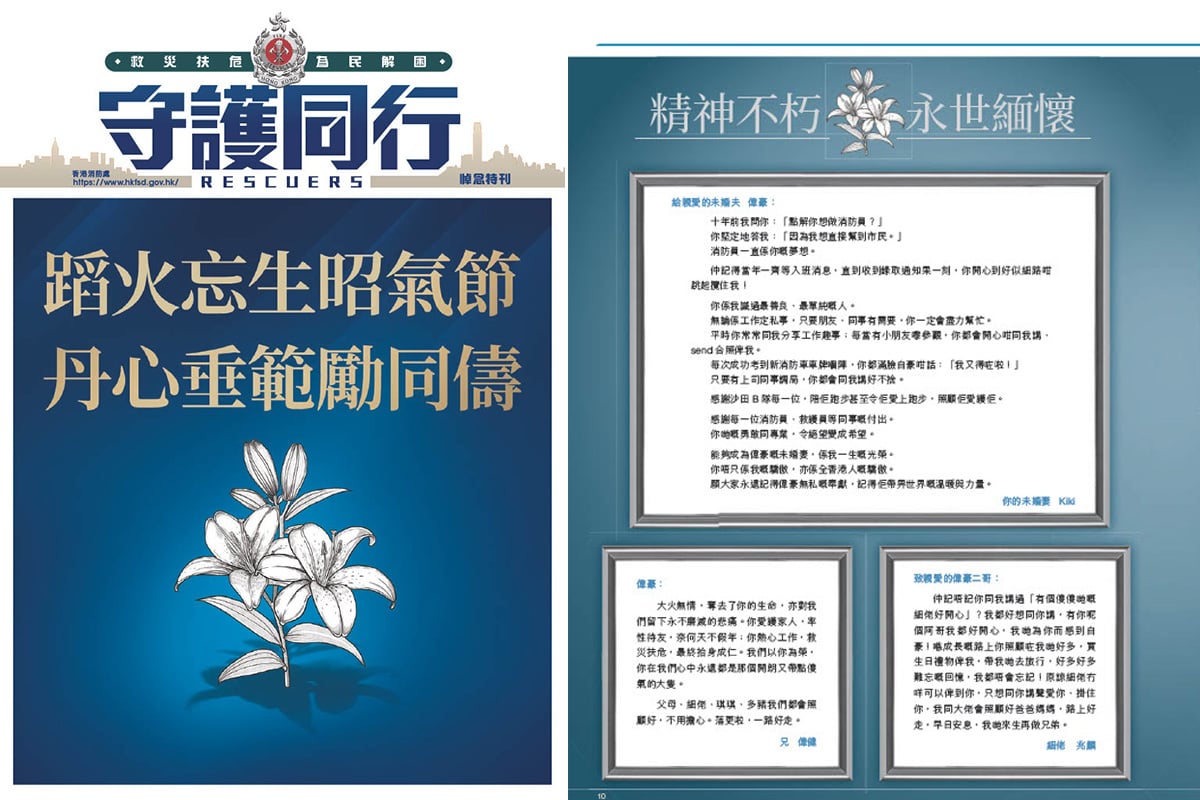 近日,消防處為於大埔宏福苑5級大火中殉職的消防員何偉豪,發布名為《守護同行》的悼念特刊,形容今次是規模前所未見的「毀滅性大火」,造成至少161人罹難,何偉豪在執行滅火搜救任務時,將個人安危置於度外,最終捨己為人,彰顯了消防處「救災扶危,為民解困」的最高使命。悼念特刊亦刊登了何偉豪未婚妻Kiki和兄弟的家書,Kiki憶述偉豪是最善良、單純的人,因為「想直接幫到市民」所以當消防員。