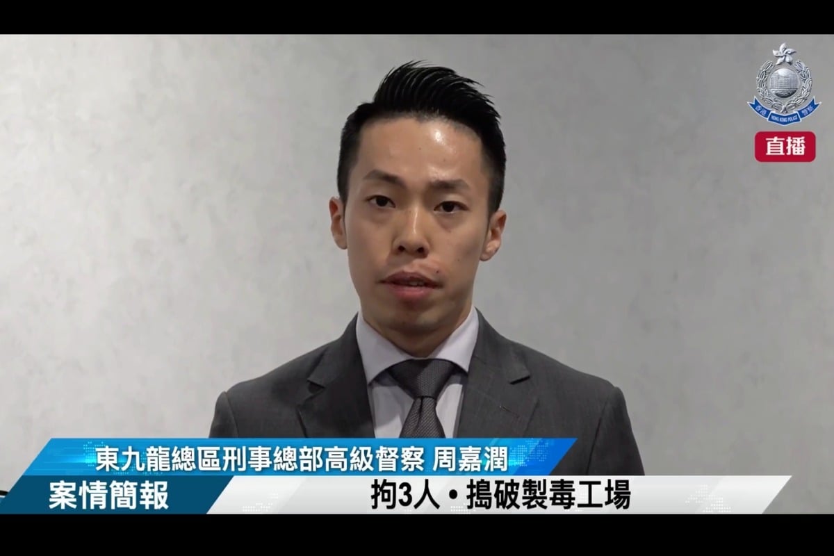 東九龍總區刑事總部高級督察周嘉潤表示,行動中在一個村屋單位內搜出大批毒品及製毒工具,包括7.9公斤可卡因、1.2公斤冰毒、741克霹靂可卡因、598克氯胺酮及259粒依托咪酯煙彈,市值約港幣774萬。