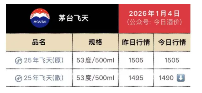 據中國第三方酒類價格訊息平台今日酒價數據顯示,1月4日,飛天茅台散瓶報1,490元/瓶,較上一日跌5元,顯示電商平台上再次出現低於1,499元/瓶官方指導價(貴州茅台指導市場上的零售價格)的售價。這是該價格連續4天下滑,較2025年12月31日下跌60元。
