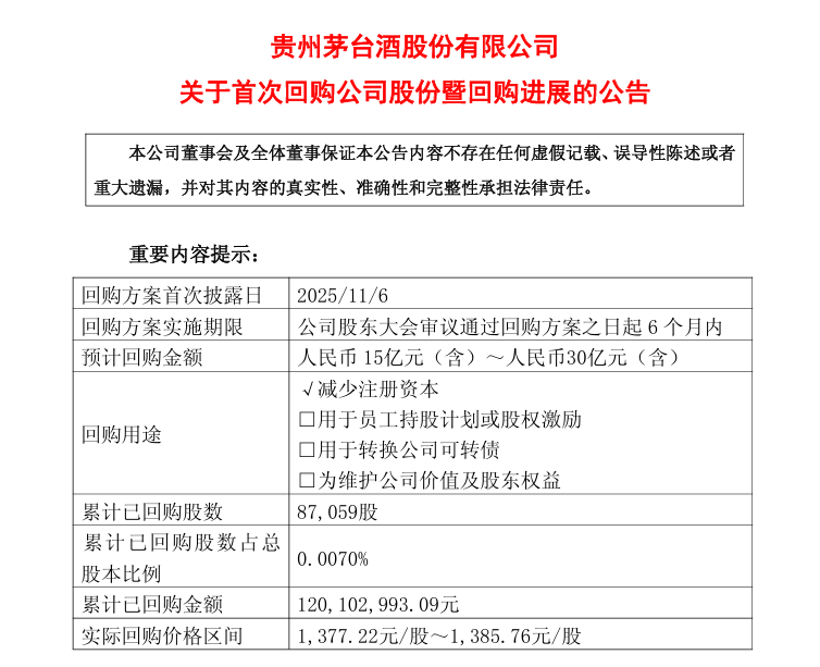 面對資本市場萎靡不振,股價下跌,貴州茅台1月4日晚發布了《關於首次回購公司股份暨回購進展的公告》,公告顯示:「2025年12月31日,公司通過集中競價交易方式首次回購股份87,059股,已回購股份佔公司總股本的比例為0.007%,購買的最高價為1,385.76元/股、最低價為1,377.22 元/股,已支付的總金額為120,102,993.09元(不含交易費用)。」