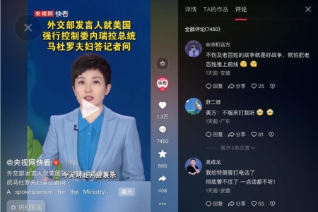 不過,對美國生擒委內瑞拉總統馬杜羅,大陸網民與官媒唱反調。在社交媒體抖音上,「中國新聞社」官方帳號上的相關消息的評論區有4萬多條網民的留言,紛紛公開諷刺、挖苦中共。