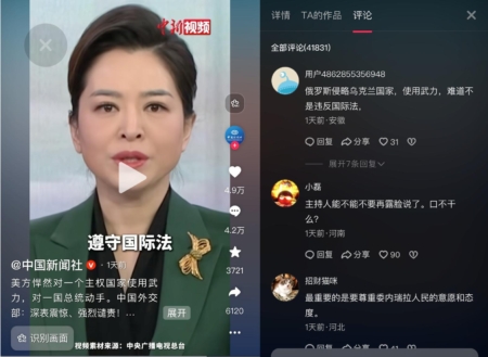 而抖音上「央視網」快看官方評道的相關消息下評論區有七千多留言,網民除了諷刺挖苦中共外,有安徽網民說,「不傷及老百姓的戰爭就是好戰爭,就怕把老百姓推上前線。」