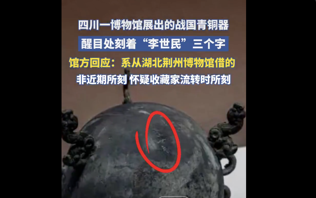 1月2日晚,有遊客在社交平台發帖稱,在綿陽市博物館「鳳兮楚兮——荊楚文物精華展」的臨時特展上,一件戰國青銅敦的表面竟刻有「李世民」三字。