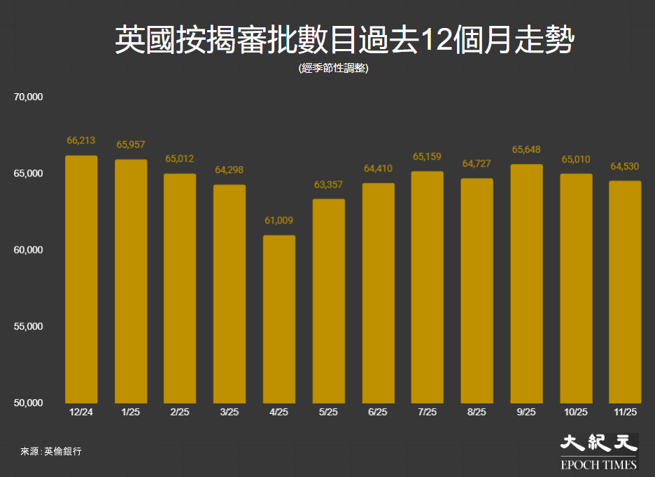 英倫銀行於當地時間1月5日,公布最新多項借貸數據,11月份經季節性調整後的按揭(作買樓用途)審批數目為64,530宗,高於市場預期的64,400宗,上月錄得65,010宗。審批數目可作未來數月按揭借貸方向的參考。數值連續下跌兩個月,創近五個月低位。