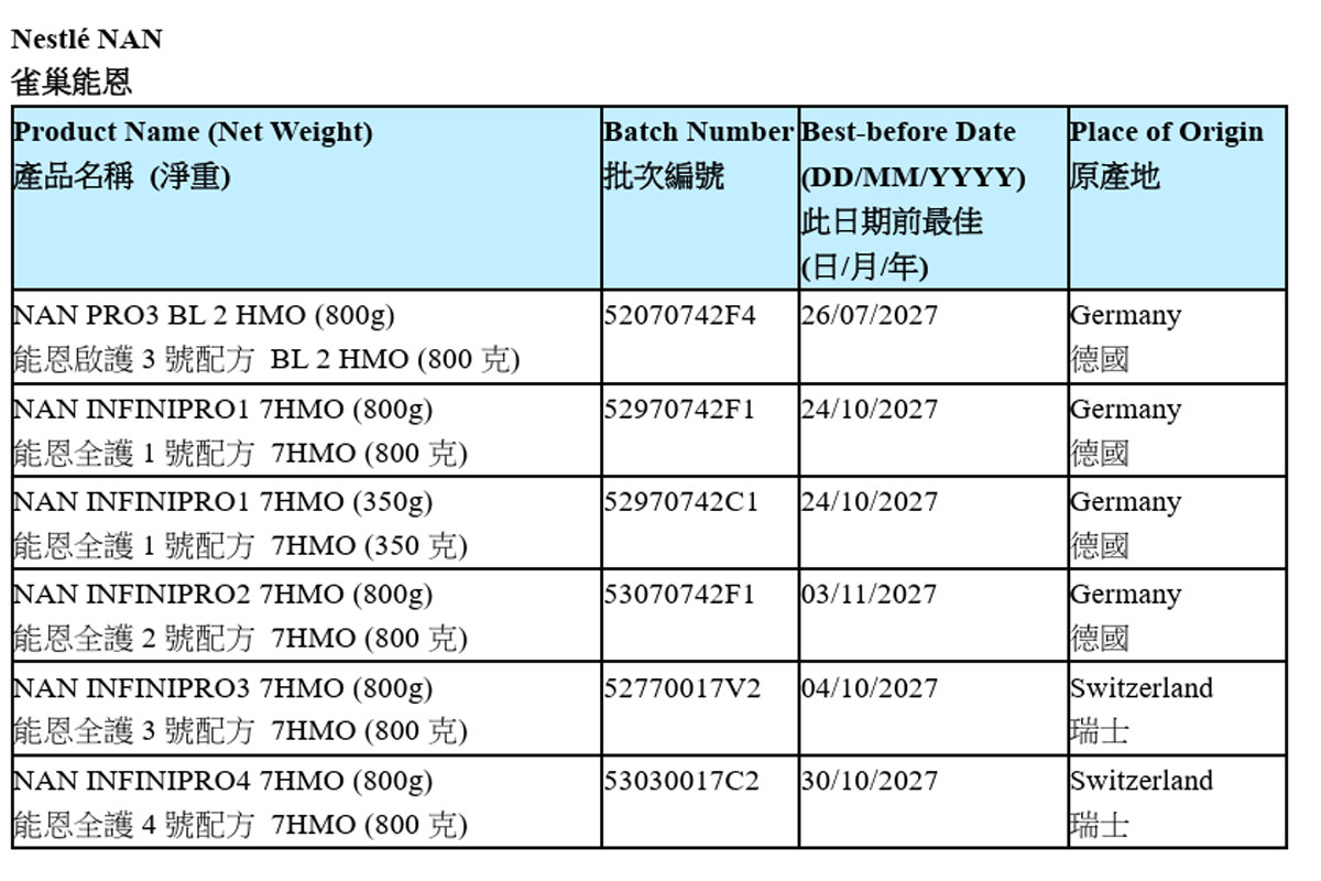 涉及的品牌包括「雀巢能恩」(NAN)、「惠氏ILLUMA」及「S-26 ULTIMA」系列。