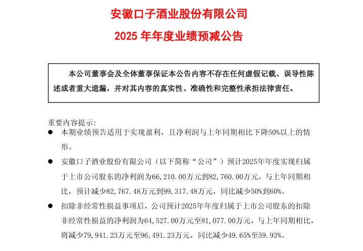 口子窖在7日的《2025年年度業績預減公告》中表示:「預計2025年年度實現歸屬於上市公司股東的淨利潤為66,210.00萬元(人民幣,下同)到82,760.00萬元,與上年同期相比,預計減少82,767.48萬元到99,317.48萬元,同比減少50%到60%。」