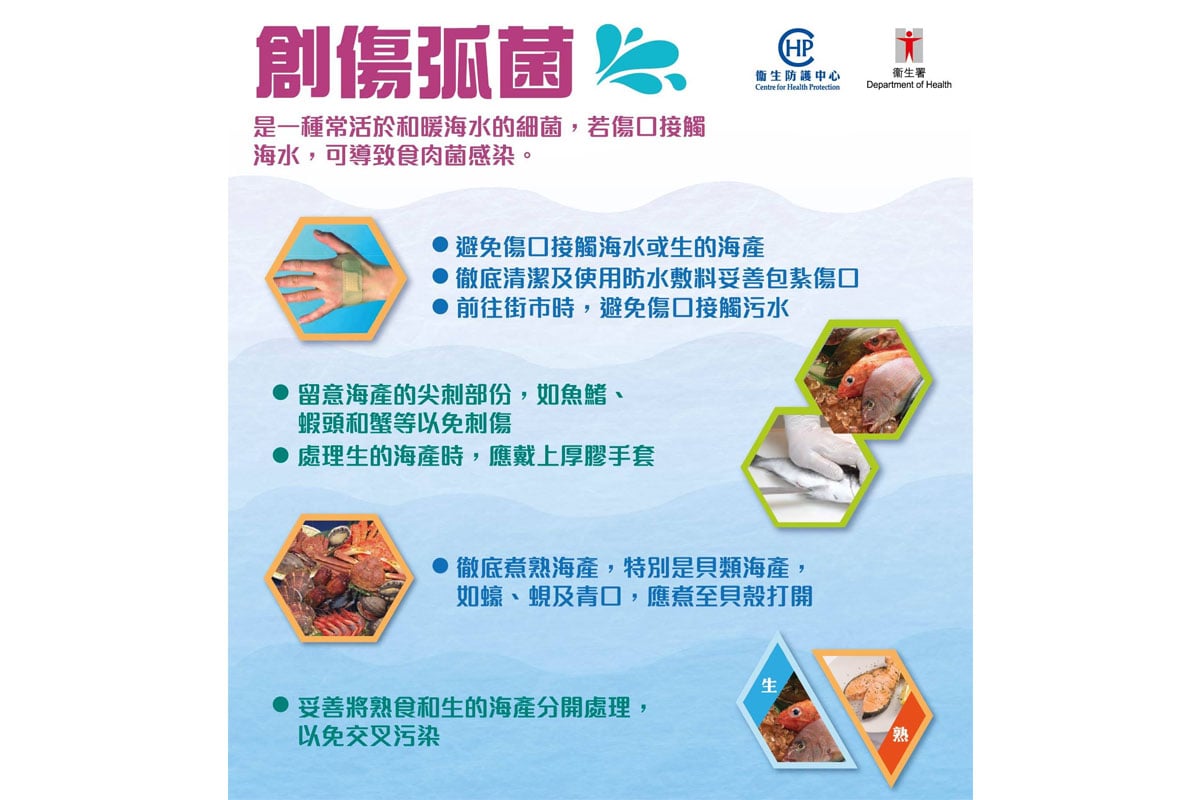 衞生防護中心提醒市民,到訪濕街市時,應避免皮膚接觸污水,並帶備酒精消毒液;切勿使用攤擋提供的公用毛巾;預備海產時,應帶上手套,若出現傷口應妥善處理,並停止接觸生海鮮;烹調方面,應避免進食被污染的生或未經煮熟的海產。@
