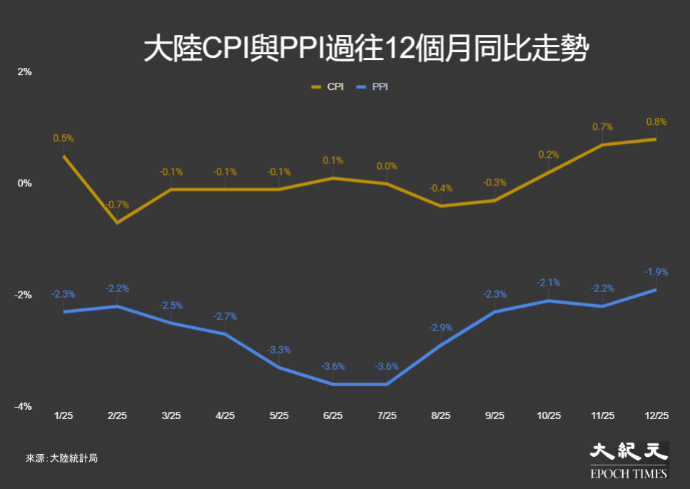 大陸統計局於9日公布最新居民消費價格指數(CPI),12月份環比錄得通脹0.2%,同比CPI漲0.8%,數值創自2023年2月以來最高,但仍低於市場所預測的0.9%升幅,上月CPI按年走高0.7%。
