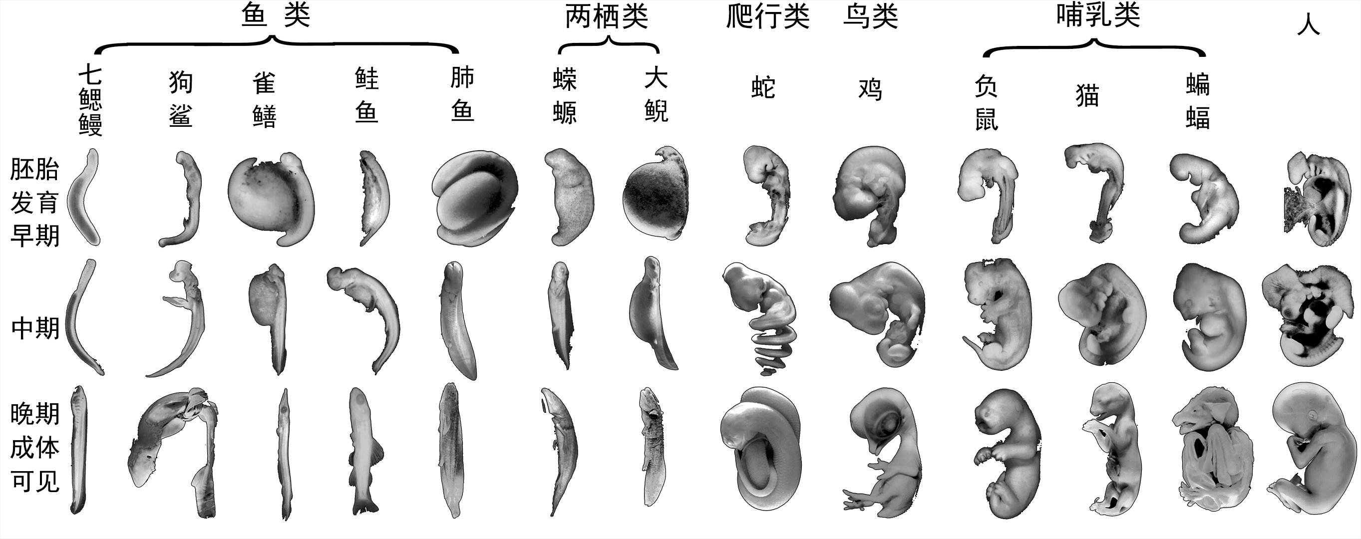 重演律稱:人、哺乳動物、鳥類、爬行類、兩棲類,早期胚胎都像前者,尤其像魚,有尾有鰭的類似結構,胚胎發育過程,「重演」了祖先的進化歷程,「證明」了這樣的進化路線:魚→兩棲類→爬行類→鳥類和哺乳類。