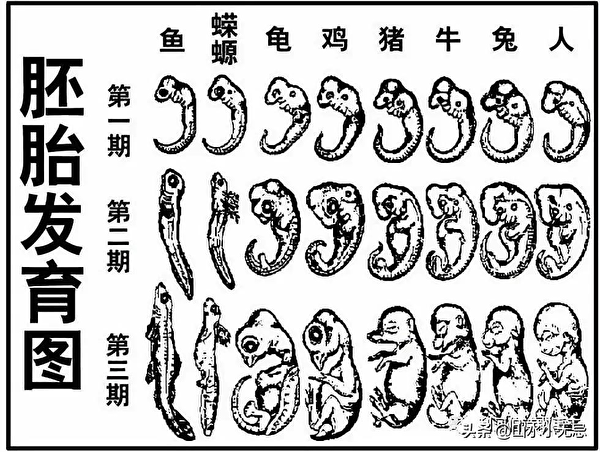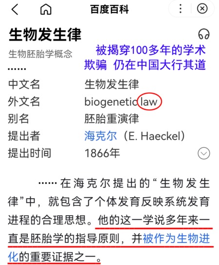 海克爾重演律,這個十足的學術假貨,在中國高中生物課本上為進化論證明了幾十年,直到21世紀才悄悄撤除,卻不告知原因。但在影響力很大的「百度百科」等大型網站上,仍偽裝成科學規律給人洗腦。#(未完待續)