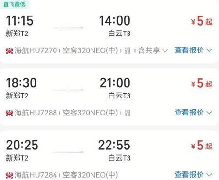 甚至有網民晒出,從鄭州到廣州的機票價格5元起,廣州飛北京只要130元。成都飛海口90元、廣州飛西安50元、成都飛廣州80元……