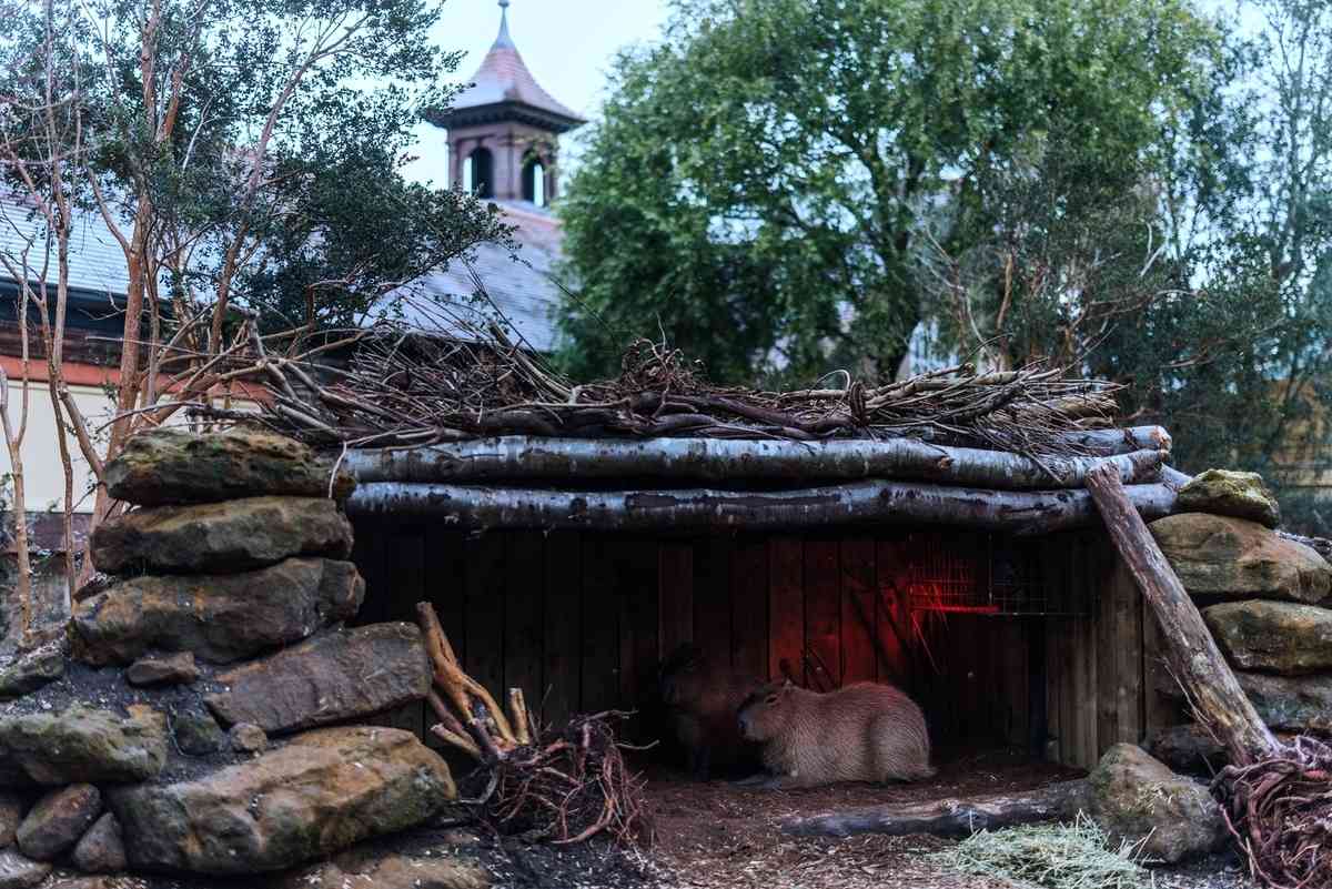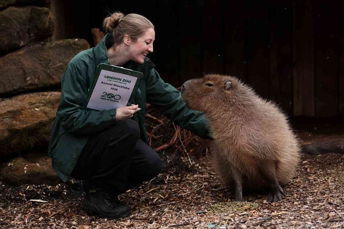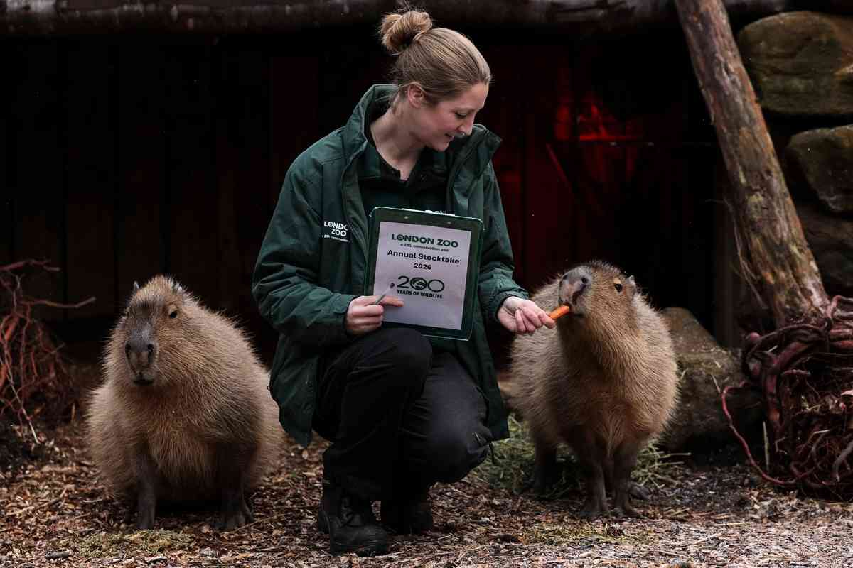 2026年1月6日,英國倫敦動物園開始對園內飼養的動物進行一年一度的大盤點。圖為盤點活動期間,飼養員霍莉‧莫寧(Holly Morning)給水豚餵食。(Adrian Dennis/AFP via Getty Images)