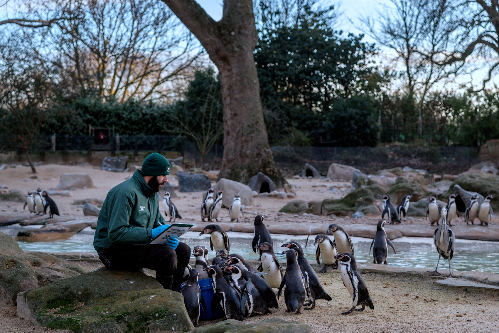 2026年1月6日,英國倫敦動物園開始對園內飼養的動物進行一年一度的大盤點。圖為飼養員傑伊‧菲爾蒂納(Jay Firtina)一邊盤點一邊餵食洪堡企鵝。(Dan Kitwood/Getty Images)