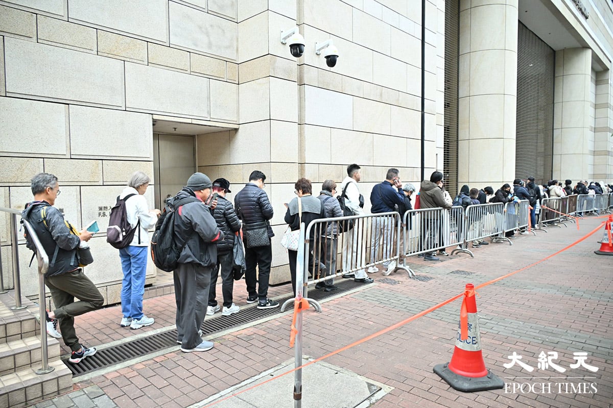 為旁聽庭審,不少市民自上周五(9日)中午起已在西九龍法院外排隊輪候。今早所見,現場已有近百人排成長龍,警方在場維持秩序,其後仍有市民陸續到場加入輪候行列。