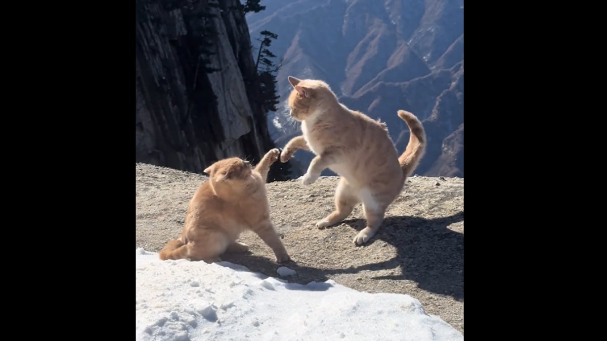 1月8日,在陝西渭南華山的西峰頂上,兩隻橘貓在懸崖邊互動打鬧,宛如「高手過招」。有網民在社交媒體上傳的影片顯示,兩隻貓互相揮爪,你來我往,然後又糾纏在一起,你抓我抓,你踢我踢。最後兩隻貓又依偎在一起,顯得親密無間。但場面看起來非常緊張,因為旁邊就是懸崖。