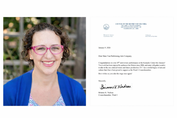 自1月7日神韻開啟今年在甘迺迪中心的首場演出,幾天來神韻美名在美國首都廣傳。1月9日,華盛頓市議員、公共工程與營運主席納多(Brianne Nadeau)女士給神韻藝術團發來賀信,祝賀神韻成立二十周年之際,再一次在甘迺迪中心演出。她說,這場充滿創意的古典音樂和舞蹈演出深受華盛頓特區觀眾喜愛。納多議員為能夠予以支持而感到自豪。