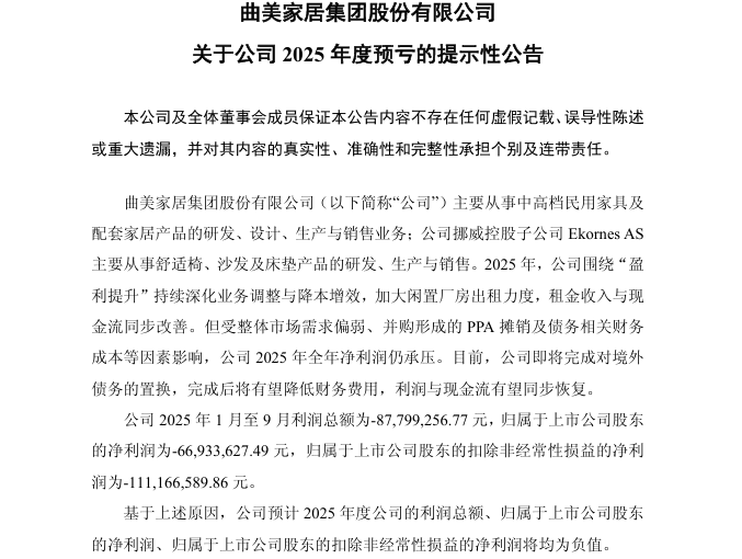 曲美家居在11日發布的《關於公司2025年度預虧的提示性公告》中表示:「公司2025年1月至9月利潤總額為-87,799,256.77元(人民幣,下同),歸屬於上市公司股東的淨利潤為-66,933,627.49元,歸屬於上市公司股東的扣除非經常性損益的淨利潤為-111,166,589.86元。基於上述原因,公司預計2025年度公司的利潤總額、歸屬於上市公司股東的淨利潤、歸屬於上市公司股東的扣除非經常性損益的淨利潤將均為負值。」