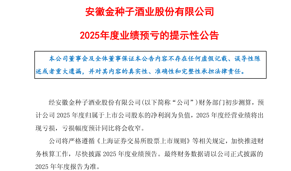 金種子酒在12日發布的《2025年度業績預虧的提示性公告》中稱:「財務部門初步測算,預計公司2025年度歸屬於上市公司股東的淨利潤為負值,2025年度經營業績將出現虧損。」