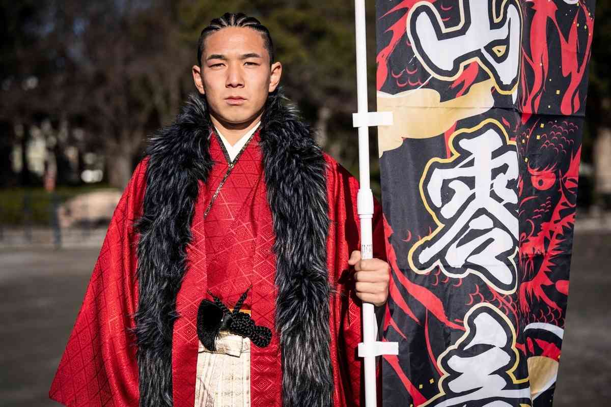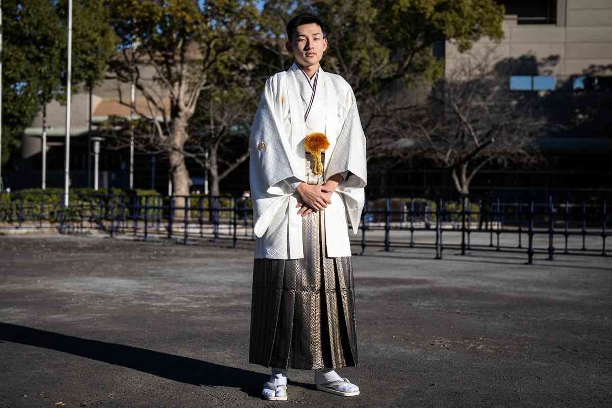 2026年1月12日,神奈川縣川崎市,大學生Kosei Yamanaka在Todoroki體育館參加成人典禮前,擺姿勢拍照。(Yuichi Yamazaki/AFP via Getty Images)