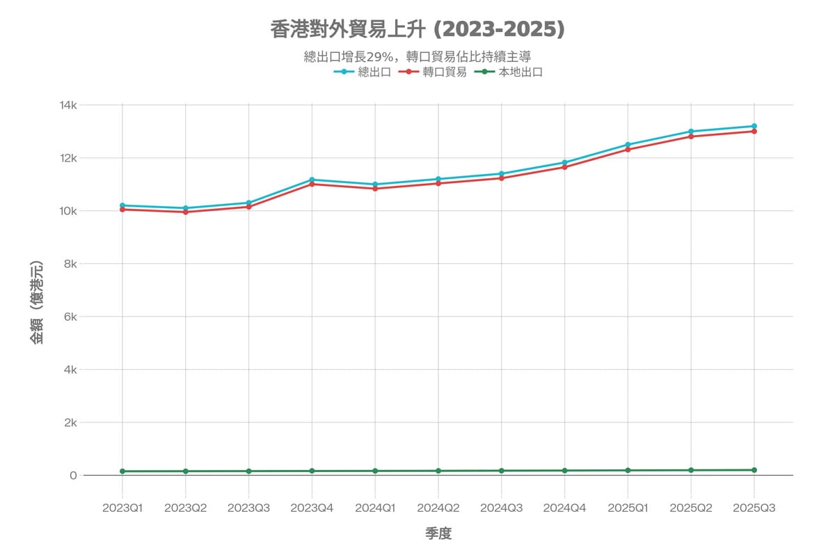 過去幾年,不少香港本地貨代、貿易商與物流服務供應商普遍感受到港口吞吐量不足、轉口貿易疲弱的壓力,最明顯的變化是在2023年,香港與中國大陸全面恢復通關,業界本來寄望能帶動本港貿易,但現實是出口連跌13個月,昔日作全球港口龍頭的葵青貨櫃碼頭吞吐量並無起色。2024年至2025年逐步恢復,2025年對大陸及多數亞洲市場出口明顯增長,對歐盟轉為溫和增長,但對美國出口仍然下跌。