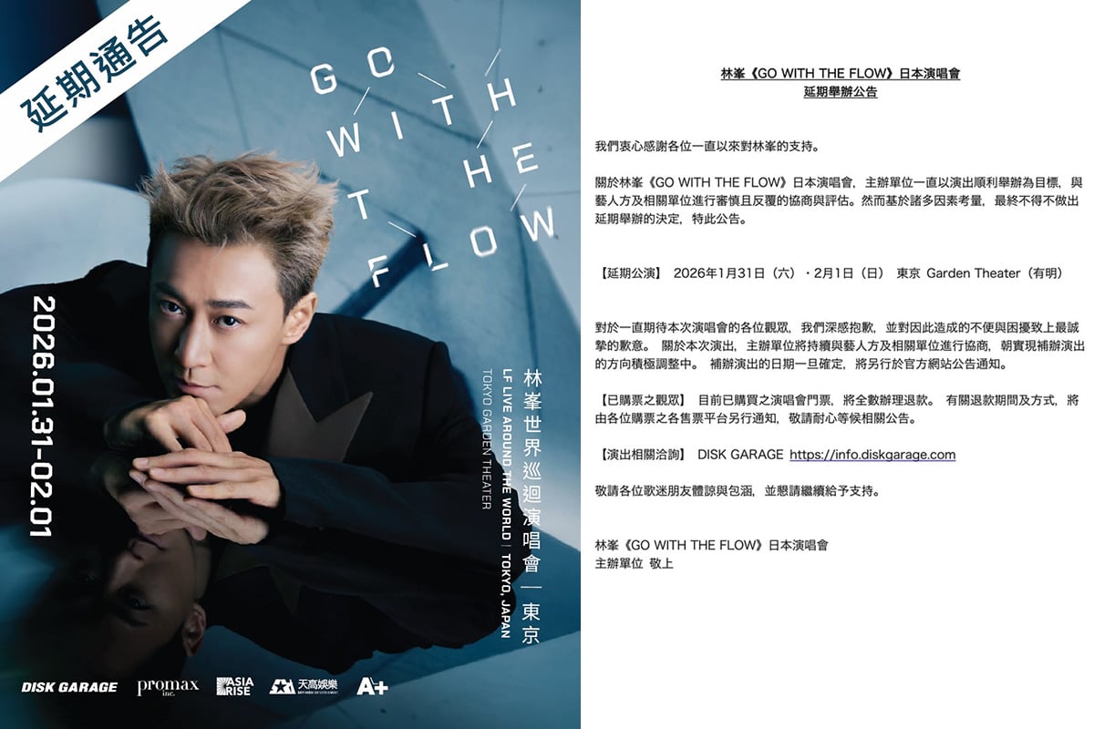因主演《九龍城寨之圍城》而爆紅的林峯,原定本月31日至2月1日首次在日本東京舉辦巡迴演唱會《GO WITH THE FLOW》。主辦方昨日(14日)在社交平台宣布演唱會延期,稱基於「諸多因素考量」,並已與藝人方及相關單位進行審慎且反覆的協商與評估。