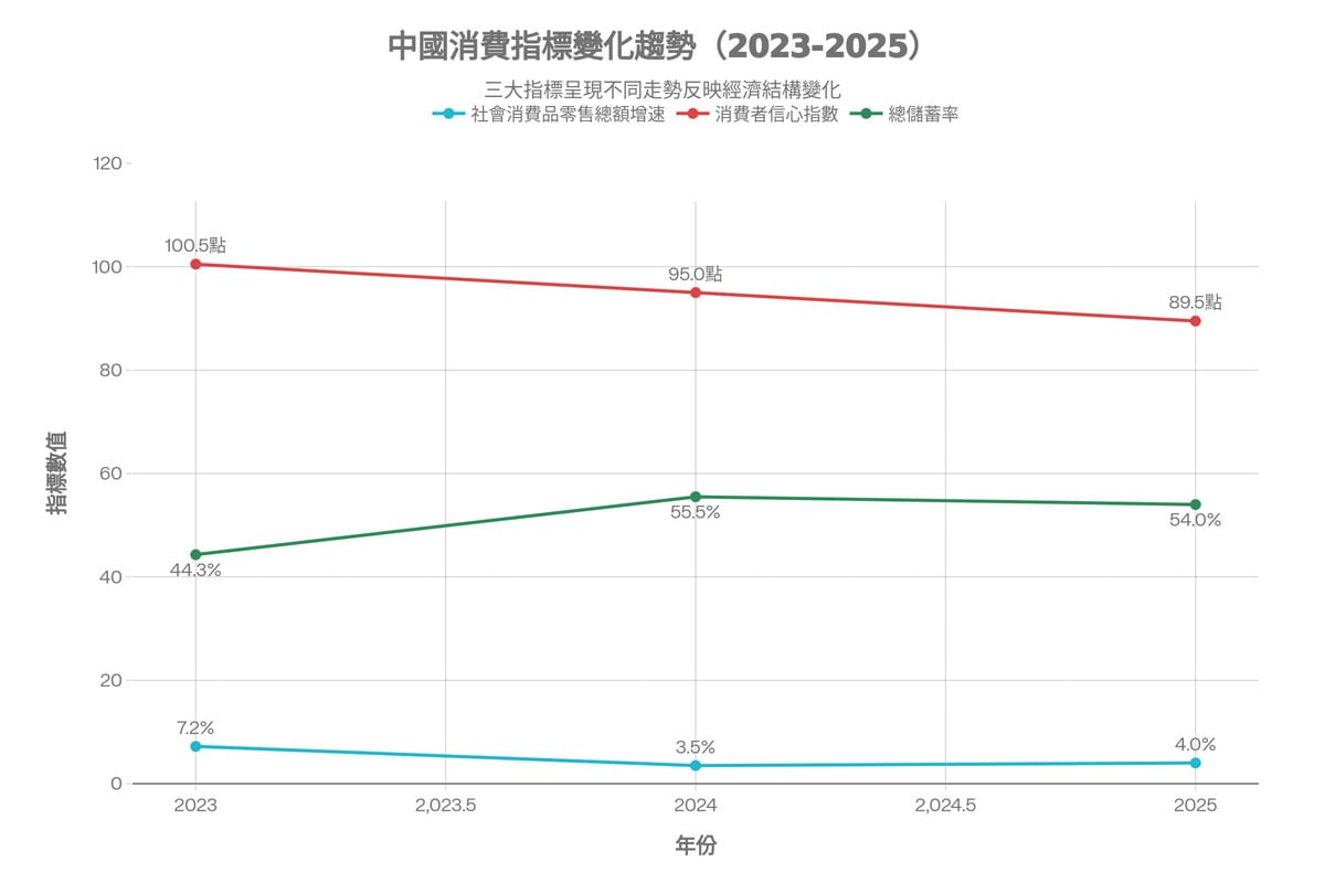 消費者信心指數自2022年4月降至100以下後,一直未能恢復到中性水平以上。2025年10月該指數僅為89.4點,遠低於1990-2025年期間108.77點的歷史平均值,與2021年2月創下的127點歷史高位相差甚遠。這反映出民眾對未來收入和經濟前景缺乏信心。